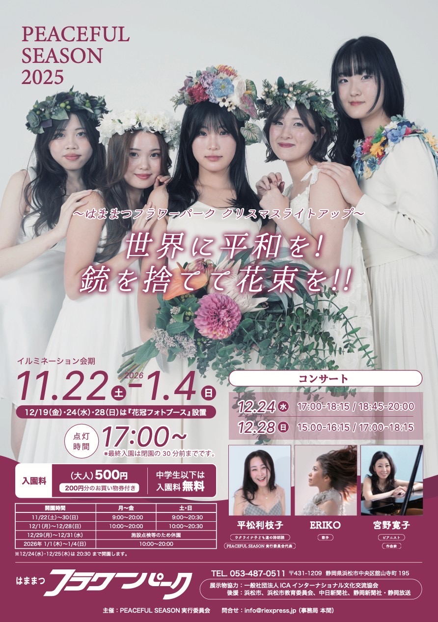 はままつフラワーパークにて素敵なイベントに出演させていただきます。 『銃を捨てて、花束を。~PEACEFUL SEASON2025~』 2025年12月24日(水)17:00-18:15、18:45-20:00 2025[…]