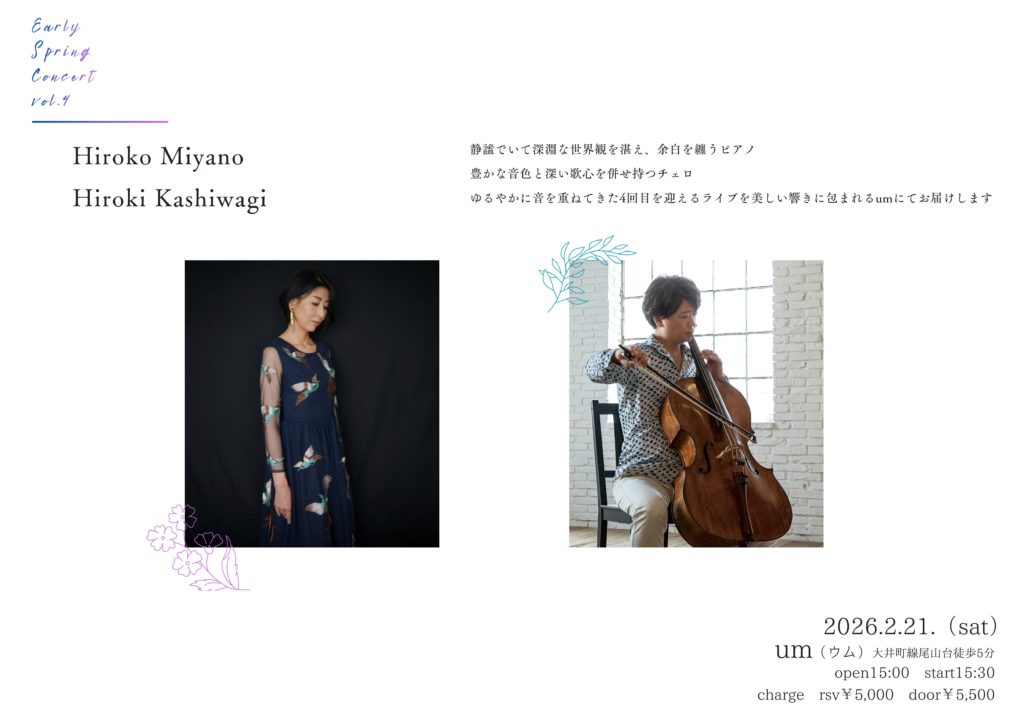 Hiroko Miyano with Hiroki Kashiwagi ゆるやかに音を重ねてきた4回目を迎えるライブ。 美しい響きに包まれるumにてお届けします。 2026.2.21.(sat) um(ウム) 大井町線尾[…]